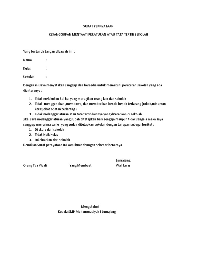 Surat pernyataan mematuhi tata tertib yang bertanda tangan di bawah ini saya. Tempat & tgl lahir : Contoh surat pernyataan kesanggupan mematuhi tata tertib sekolah. Akan menjaga nama baik diri sendiri, keluarga dan sekolah. Contoh terbaik surat permohonan kursi roda pada dinas sosia l.