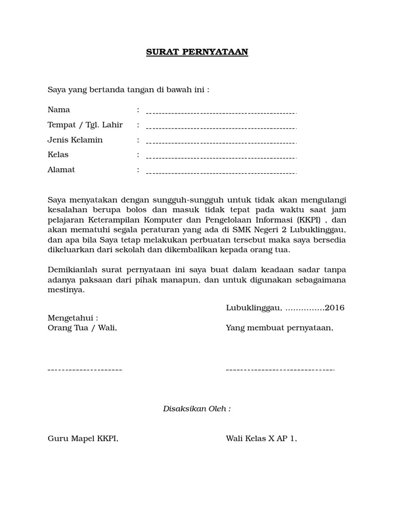 Mematuhi tata tertib guru mengajar yang diberlakukan pihak sekolah. Misalnya saja pernyataan tertulis dari atas nama sekolah. Akan menjaga nama baik diri sendiri, keluarga dan sekolah. Bersedia melaksanakan segala mekanisme sanksi tata tertib dan bekerjasama mewujudkan program sekolah 5. Justru menimbulkan keresahan karena mempersepsikan warga pesantren tidak taat hukum. 8.memelihara dan melaksanakan 7 k. Mendapatkan perlakuan yang sama, selama mematuhi tata tertib sekolah. Surat pernyataan mematuhi tata tertib yang bertanda tangan di bawah ini : Menciptakan dan memelihara hubungan baik antara sesama guru, pegawai dan komite di lingkungan sekolah /kerja maupun dalam hubungan keseluruhan. Berikut ini contoh surat pernyataan kesanggupan dan surat pernyataan kerja. Sanggup mentaati dan mematuhi tata tertib sekolah, tata tertib siswa sma. Contoh terbaik surat permohonan kursi roda pada dinas sosia l. Nama lengkap siswa (huruf kapital):